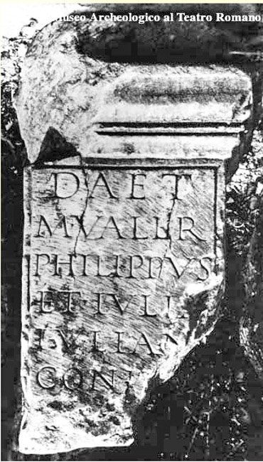 - D(eo) aet(erno) / M(arcus) Valer(ius) / Philippus / et Iulia / Iulian[a] / coniu[x] / v(otum) [---]
