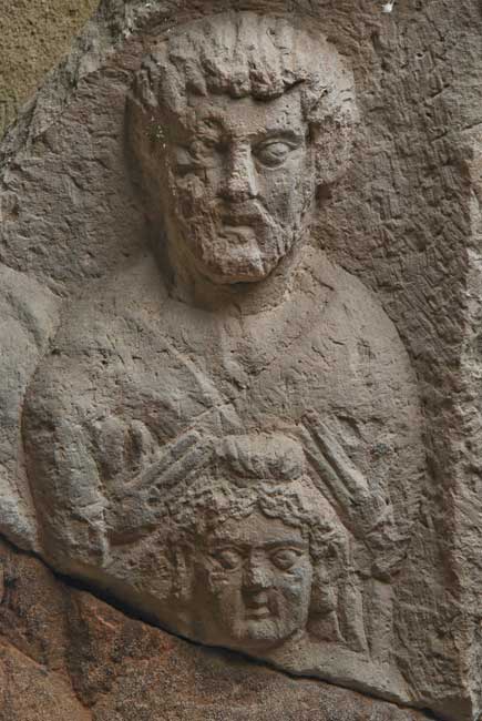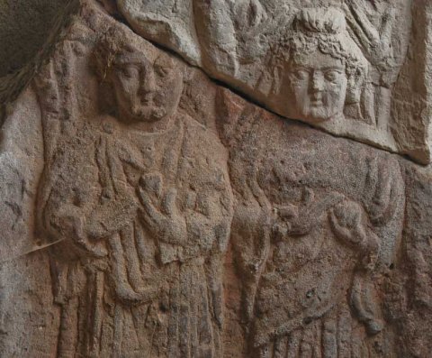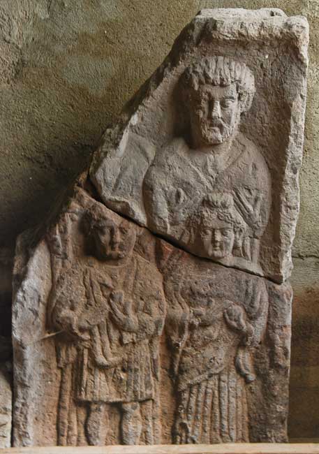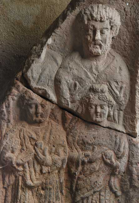 - Familie: stehende Ganzfiguren eines Ehepaares (bärtiger Mann in Paenula) mit zwei Kindern (Knabe in Ärmeltunica und Sagum, in der Linken ? und Mädchen in Tunica und Mantel, in der Linken Apfel).