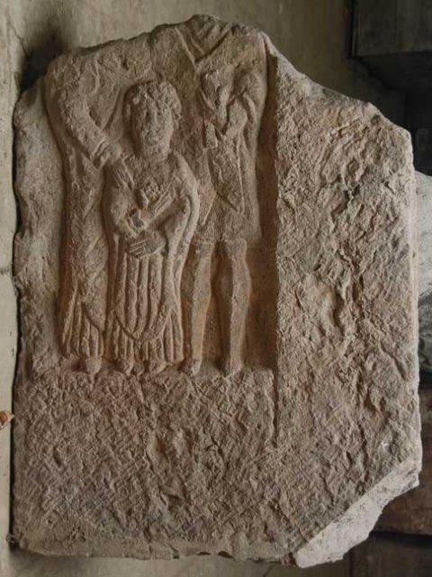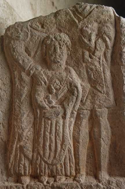 - Seitenwange mit eingetieftem Bildfeld, darin stehende Ganzfiguren einer Familie (Ehepaar mit Kind): Frau mit Ärmelkleid und Mantel, Mann in Paenula, in der Linken Rolle (volumen), Mädchen in langer Ärmeltunica und Mantel, in der Rechten Apfel. Über den Köpfen Girlande mit Vogel. auf der vorderen Schmalseite Ranke.