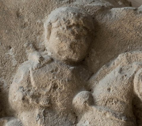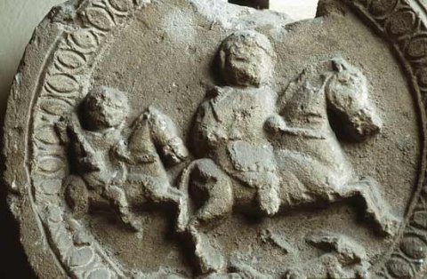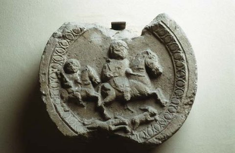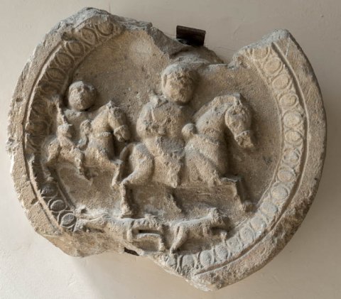 - Jagdszene in profiliertem Rahmen (Eierstab ?) Reiter, gefolgt von kleinerem Reiter, unten Hund und Hase.