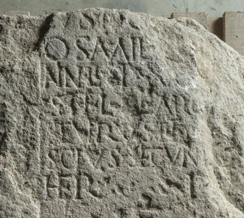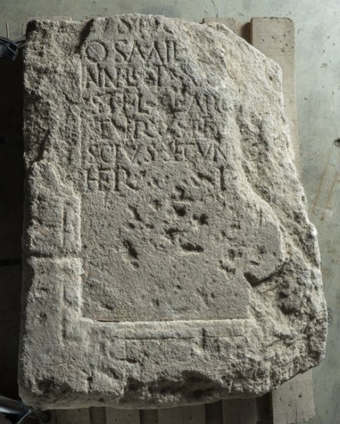 - ---] / [---]us do[mo ---] / [b(ene)f(iciarius) c]o(n)s(ularis?) mil(es) [leg(ionis) ---] / ann(orum) L st(ipendiorum) XXX[---] / s(it) t(ibi) t(erra) l(evis) Fl(avius) Arc[---] / Severus et [---]scius Secun[dianus] / her(edes) p(osuerunt)