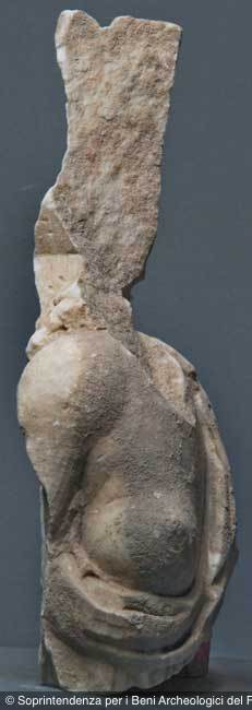 - Weiblicher Oberkörper mit Mantel, der die rechte Brust entblößt. Rechter Arm war nach hinten gesenkt (gefesselt ?). Auf der Rückseite ansetzender eckiger Pfeiler.