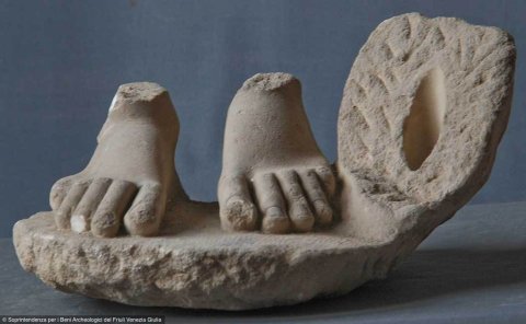 - Nackte Füße einer stehenden Figur, neben dem linken Fuß Rest einer Stütze (Delphin ?). Venus ?