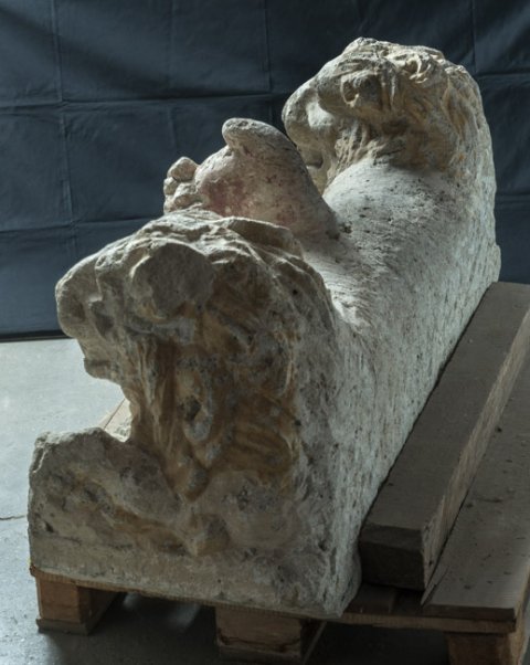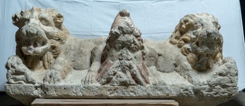 - Auf Gesims liegende Löwen, zwischen ihnen bärtiger Kopf mit phrygischer Mütze.