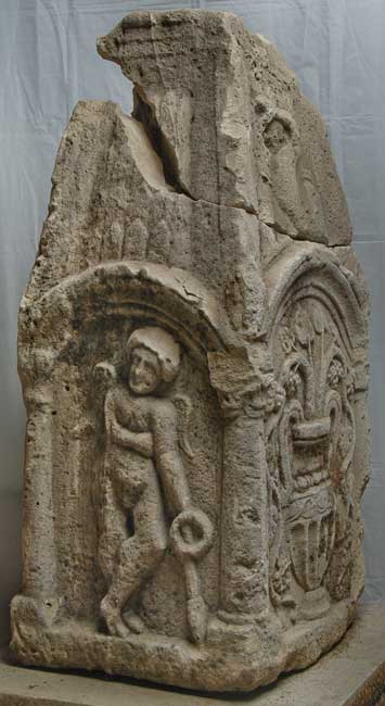 - Pfeiler mit Dach in Form eines Pyramidenstumpfes. An den vier Ecken Säulen, die Bögen tragen. Auf der Vorderseite Krater mit Weinranken. Auf dem Dach darüber Delphin. Auf der linken Nebenseite Trauergenius mit Kranz und gesenkter Fackel, auf dem Dach Schuppenmuster.