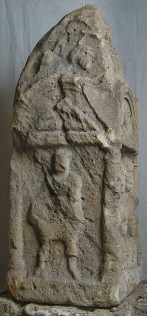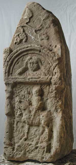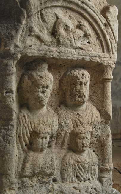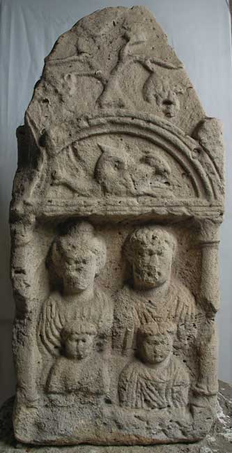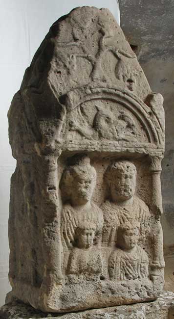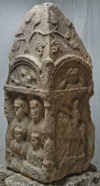 - Pfeiler mit Dach in Form eines Pyramidenstumpfes. An den vier Ecken Säulen. Auf der Vorderseite Brustbilder einer Familie : Frau mit Frisur der Faustina maior, bärtiger Mann, vor ihnen zwei Kinder (Knaben). Auf dem Dach Bogenfeld mit Meerwesen (Capricorn?), darüber Weinreben, die auch auf die Nebenseiten des Dach wachsen. Auf der linken Nebenseite stehender Mann (Soldat ?), Relief im Bogen zerstört. Auf der rechten Nebenseite Reiter, im Bogenfeld darüber weibliche Büste mit langem Haar.