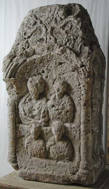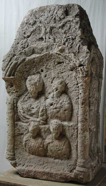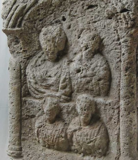 - Pfeiler mit Dach in Form eines Pyramidenstumpfes. An den vier Ecken Säulen, die Bögen tragen. Auf der Vorderseite Brustbilder einer Familie: oben Ehepaar (oder Frau und Knabe ?), unten zwei Kinder (Mädchen und Knabe im Sagum). Auf dem Dach Weinranken, die auch auf die Nebenseiten wachsen. Auf der rechten Nebenseite auf Podest stehender Mann (Diener) in kurzer Tunica mit mappa und Korb.