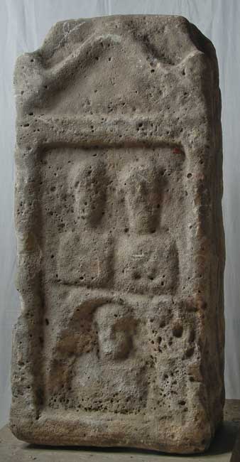 - Pfeiler mit Dach in Form eines Pyramidenstumpfes. An den vier Ecken Säulen, die einen Giebel mit Akroteren tragen. Auf der Vorderseite Brustbilder einer Familie in zwei Registern: oben Ehepaar , unten ein Mann in Bogennische. Auf der linken Nebenseite Attis.