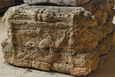 - Auf vier Seiten reliefierter Block. Auf den Längsseiten jeweils Kopf (Jupiter Ammon, Gorgoneion ?) zwischen liegenden Löwen, auf den Schmalseiten gerahmte Bildfelder mit Delphin und Fisch, darüber pulvini.