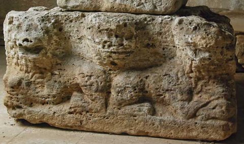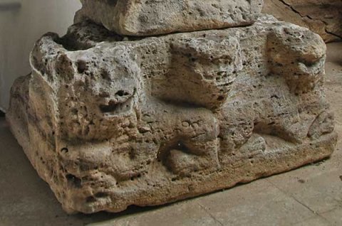 - Auf vier Seiten reliefierter Block. Auf den Längsseiten jeweils Kopf (Jupiter Ammon, Gorgoneion ?) zwischen liegenden Löwen, auf den Schmalseiten gerahmte Bildfelder mit Delphin.