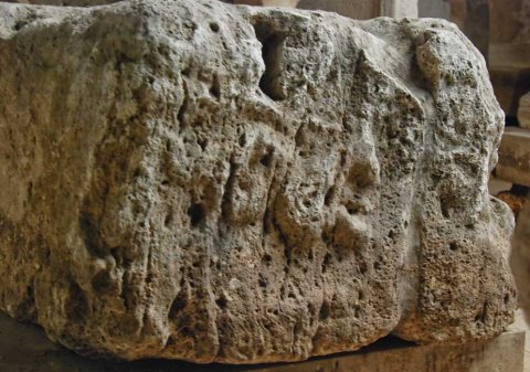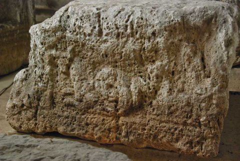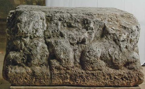 - Auf drei Seiten reliefierter Block. Auf der Längsseite Kopf (Jupiter Ammon ?) zwischen liegenden Löwen, auf den Schmalseiten Meerwesen (Hippokamp ?, Seestier).