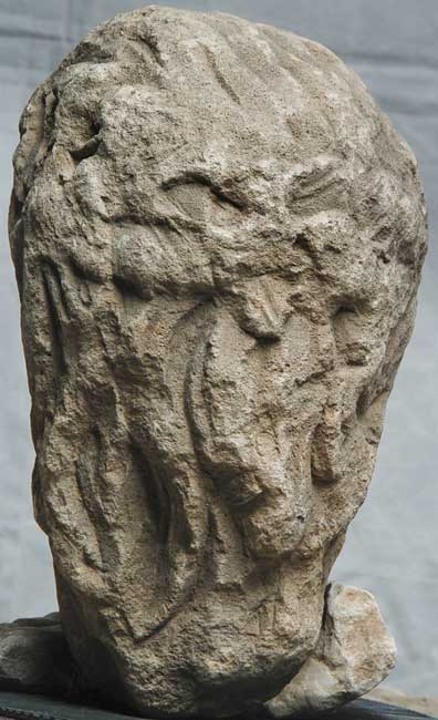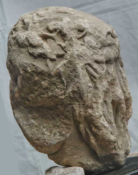 - Mythische Figur (Mänade ?): Frauenkopf mit offenem Haar und Efeukranz.