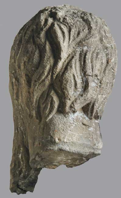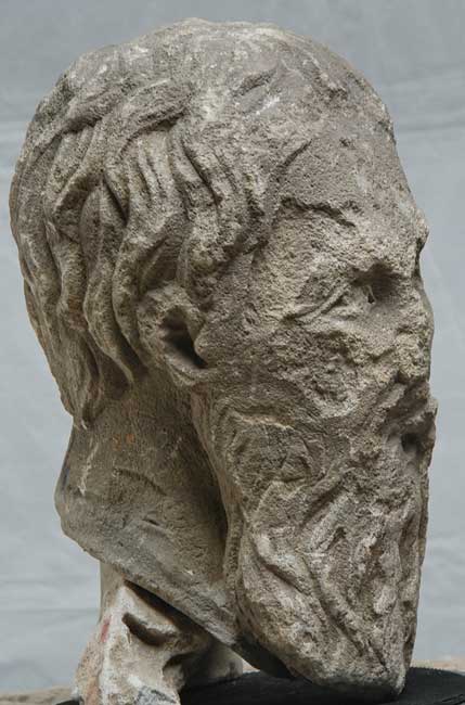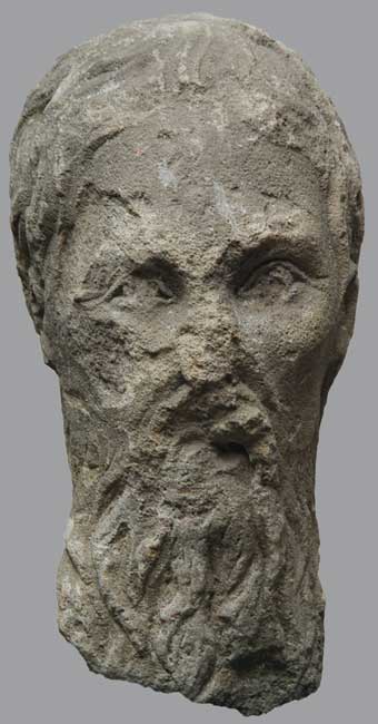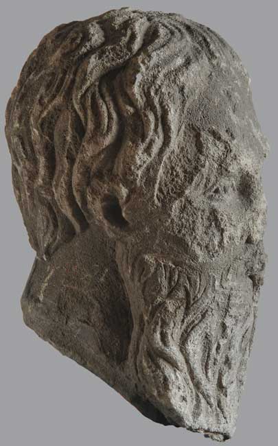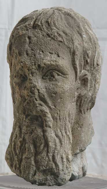 - Kopf eines Mannes mit strähnigem Haar und langem Bart (Daker, Decebalus ?)
