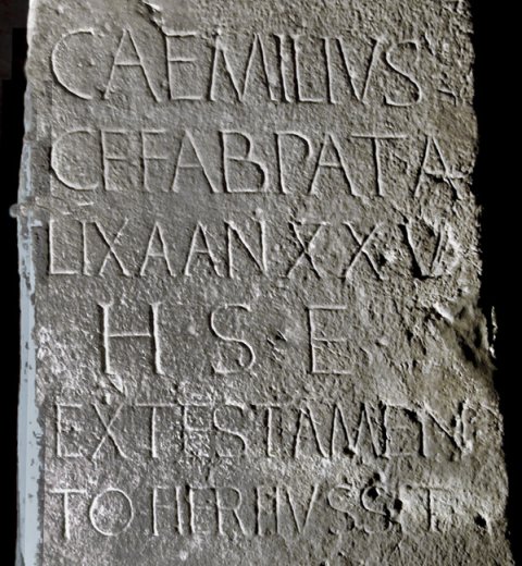 - C(aius) Aemilius / C(ai) f(ilius) Fab(ia) Pata(vio) / lixa an(norum) XXV / h(ic) s(itus) e(st) / ex testamen/to fieri iussit