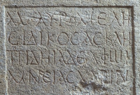 - griechisch: Μ(ᾶρκος) Αὐρ(ήλιος) Μελη/σίδικος Ἀσκλη/πίδῃ ἀδελφῷ / μνέας χάριν