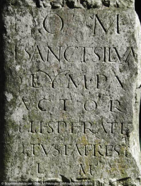 - I(ovi) O(ptimo) M(aximo) / [e]t Sanct(o) Silva[n(o)] / Olympu[s] / actor / [A]eli Sperati |(centurionis) / [ex v]etustat(e) resti[t(uit)] / l(ibens) m(erito)
