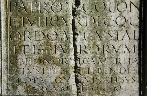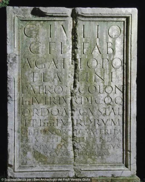 - C(aio) Iulio / C(ai) f(ilio) Fab(ia) / Agathopo / flamini / patron(o) colon(iae) / IIIIvir(o) iur(e) dic(undo) q(uin)q(uennali) / ordo Augustal(ium) / et IIIIIIvirorum / ob honori[f]ica merita / eius et in [ex]hibendis / populo voluptatibus / largum [n]itorem