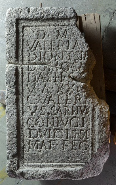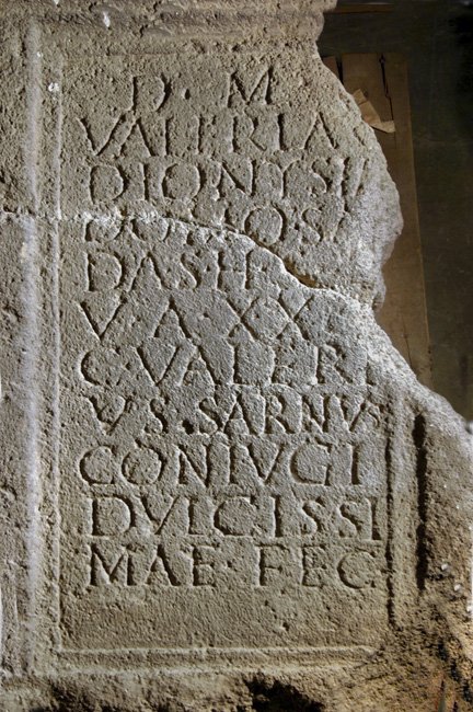 - D(is) M(anibus) s(acrum) / Valeria / Dionysia / domo Sa[r(mizegetusa)] / Da(ciae) s(uperioris) h(ic) s(ita) / v(ixit) a(nnos) XX / C(aius) Valeri/us Sarnu[s] / coniugi / dulcissi/mae fec(it)