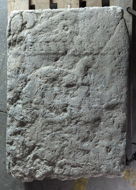 - Im Giebel Rosette zwischen Blättern, darunter Flechtband. Auf den Giebelecken Delphin. Im Bildfeld Pferd nach rechts (nur Umrisse erkennbar).