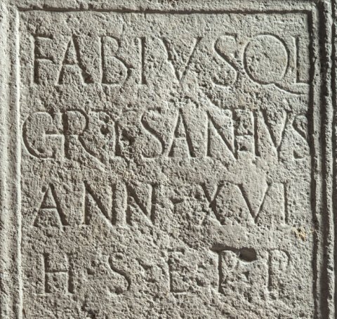- Fabius Q(uinti) l(ibertus) / Chrysanthus / ann(orum) XVI / h(ic) s(itus) e(st) p(ater) p(osuit)