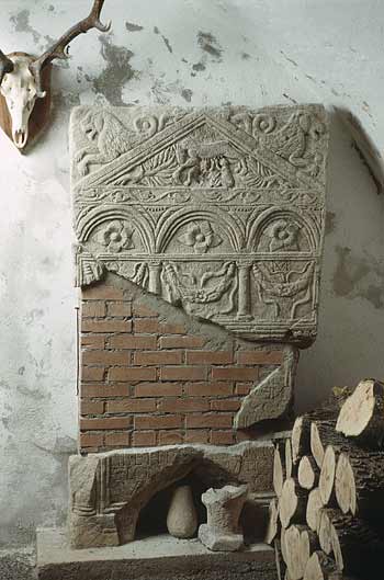 Eingeschriebener Giebel (Mythos, Meerwesen) : Lupa Capitolina zwischen Blättern, auf den Giebelschrägen Seepanther, auf dem unteren Rahmen Efeuranke.