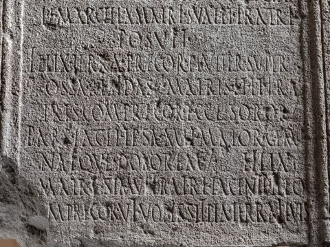 - Veiana Hospita / ann(orum) XLV h(ic) s(ita) e(st) et / L(ucius) Fabricius / Clemens mil(es) coh(ortis) I praetor(iae) / L(uci) Fabrici evoc(ati) f(ilius) qui decessit in praet(orio) / ann(orum) XXIIX stip(endiorum) VIII [---] Fabricia / L(uci) f(ilia) Marcella matri suae et fratri / posuit / felix terra precor leviter super / ossa residas matris et et fra/tris comprecor ecce soror / pars iacet ipsa mei maior gemi/natque dolorem filia / matri simul fratre iacent filio / [co]mprecor ut vobis sit pia terra levis