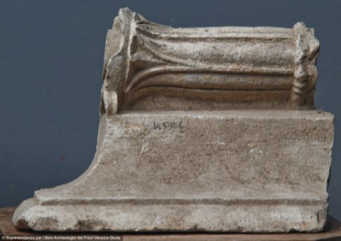 - Fragment eines geschnürten pulvinus mit Blattdekor, darunter Ecke einer profilierten Deckplatte