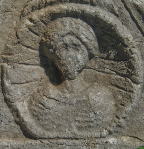 - Oberteil einer Stele mit eingeschriebenem Giebel, darin Muschelnische mit bekleideter Frauenbüste. Seitlich des Giebels Zweige und Vögel.