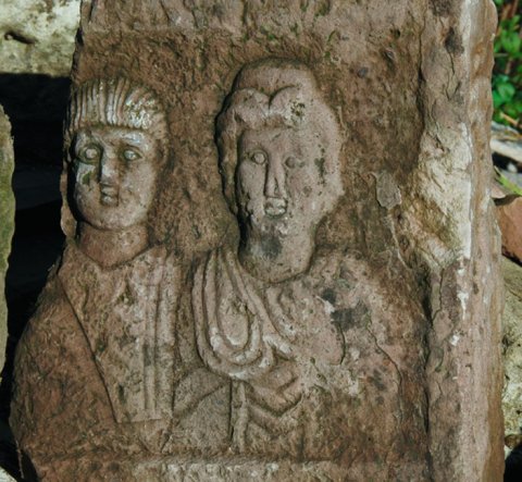 - im oberen Bildfeld Brustbilder eines Jünglings im Sagum und einer Frau mit Mantel. Links weitere Person ? Auf der Nebenseite Schlange (Ranke ?).