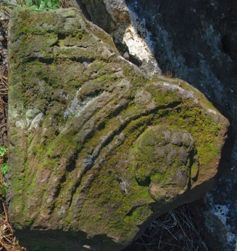 - Unter profiliertem Bogen Kopf eines Mannes, im Zwickel über dem Bogen Akanthusblatt-Rosette.