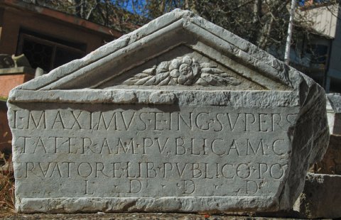 - Cl(audius) Maximus et Ing(enuvius) Superst(es) / [s]tateram publicam cu[m] / [S]ervatore lib(erto) publico po[suer(unt)] / l(ocus) d(atus) d(ecreto) d(ecurionum)