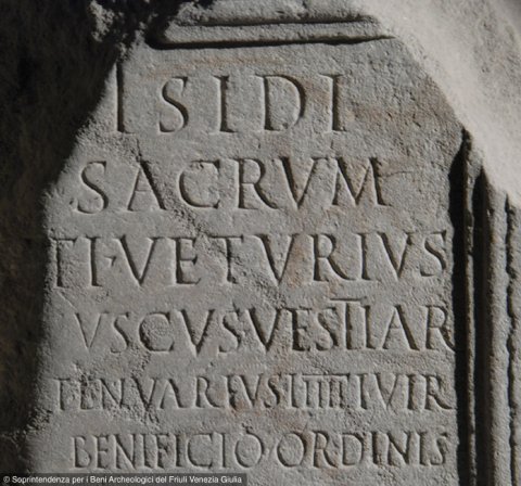 - Isidi / sacrum / Ti(berius) Veturius / Fuscus vestiar(ius) / tenuarius IIIIIIvir / beneficio ordinis