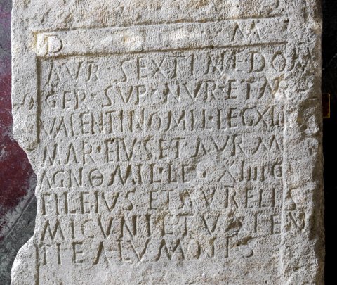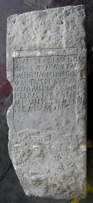 - D(is) M(anibus) / Aur(eliae) Sextin(a)e dom/o Ger(mania) sup(eriore) nur(ui) et Aur(elio) / Valentino mil(iti) leg(ionis) XIIII G(eminae) / mar(ito) eius et Aur(elio) M/agno mil(iti) leg(ionis) XIIII G(eminae) / fil(io) eius et Aurelis / Micuni et Valen/ti(a)e alumnis