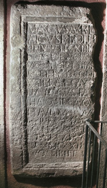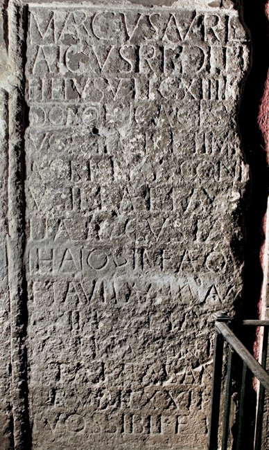 - Marcus Aur[e]l(ius) / Aficus Rediti / filius vet(eranus) leg(ionis) XIIII G(eminae) / domo Nicapolis vi/vos(!) sib(i) et Septimi/ae Crispinae coni/ugi meae et Aure/liae Augustae f/iliae qui meae qu/ietavit an(n)orum / quinque et Aure[l]/iae Septumin(a)e lib/ertae meae ann/orum LXXIII v/ivos(!) sibi fe(c)it