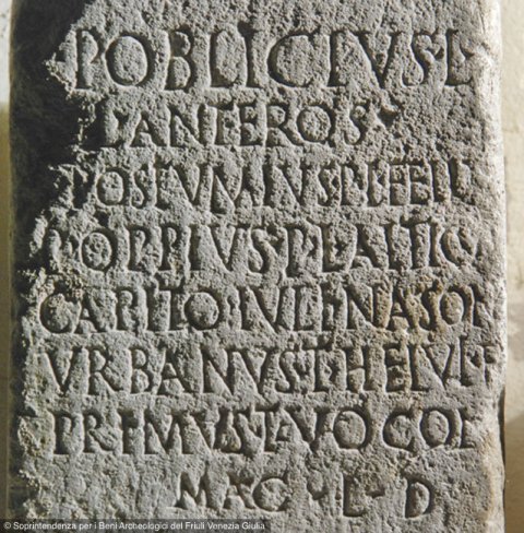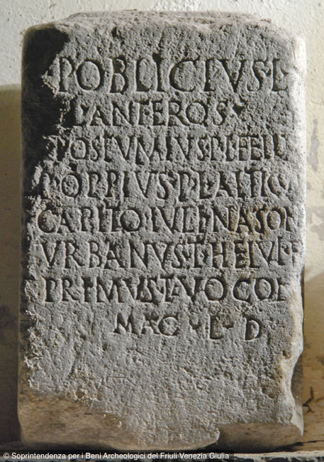 - [L(ucius)] Poblicius L(uci) / l(ibertus) Anteros / Postumius P(ubli) l(ibertus) Felix / P(ublius) Oppius P(ubli) l(ibertus) Atticu[s] / Capito Iuli Nason(is) / Urbanus T(iti) Helvi f(ilii) s(ervus) / Primus T(iti) Vocon[i] / mag(istri) l(ibentes) d(ederunt)