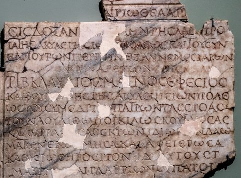Μαξίµ[ω κ]αὶ Γλαβρίωνɛ ὑπάτοɩς. / Tib(erius) Claud(ius) Magnus / dom(o) Ephesius dec(urio) c[ol(oniae?) ---] / [---]rundo [ven]atorum(?) p[atronus? - Funktion