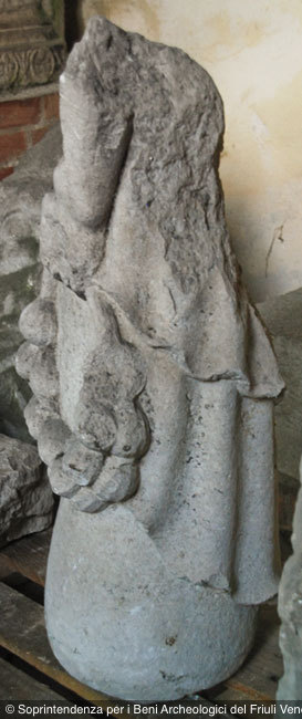 - glatte konische Säule, über die Gewandfalten hängen, links davon Hand, die Kranz mit Mohnkapseln (?) hält. Teil einer Statuenstütze ?
