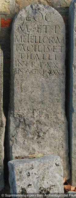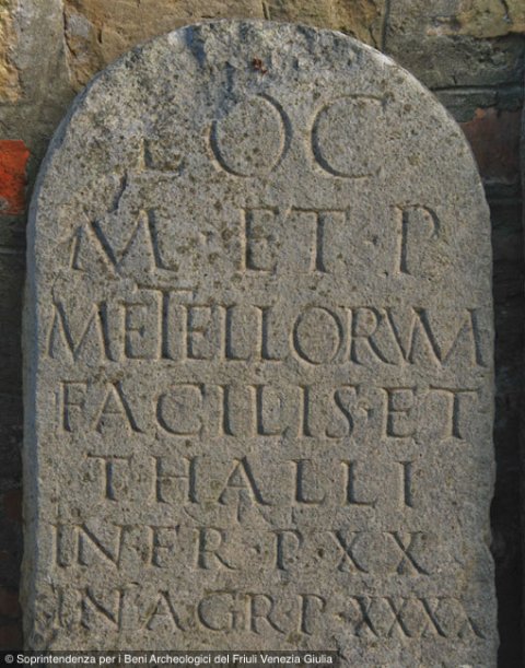 - Loc(us) / M(arci) et P(ubli) / Metellorum / Facilis et / Thalli / in fr(onte) p(edes) XX / in agr(o) p(edes) XXXX