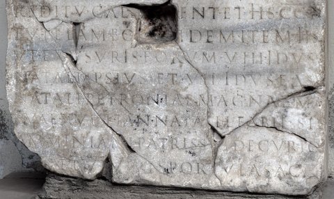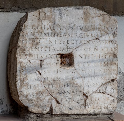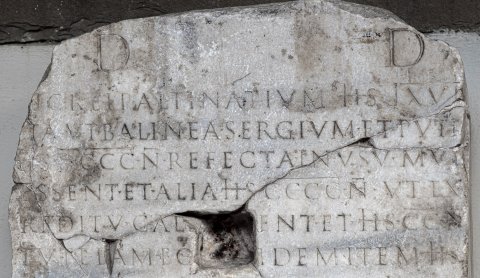 - ---] ? / d(ecreto) d(ecurionum) / [h]ic rei p(ublicae) Altinatium HS XVI(milia) [n(ummum) ded(it)] / [i]ta ut balinea Sergium et Puti[nium] / HS DCCC(milia) n(ummum) refecta in usu mu[nicip(um?)] / essent et alia HS CCCC(milia) n(ummum) ut ex [eorum] / reditu cale[fier]ent et HS CC(milia) n(ummum) [in perp(etuam)] / tutelam eo[ru]ndem item HS [CC(milia) n(ummum)] / ut ex usuris eorum VII Idus [---] / natali ipsius et VII Idus eas[dem] / natali Petroniae Magnae ma[tris] / suae XVII Kal(endas) Ian(uarias) natali L(uci) Fabii St[ellat(ina)] / Amminiani patris sui decurio[nes] / [Au]g(ustales) et seviri sportulas acci[perent]