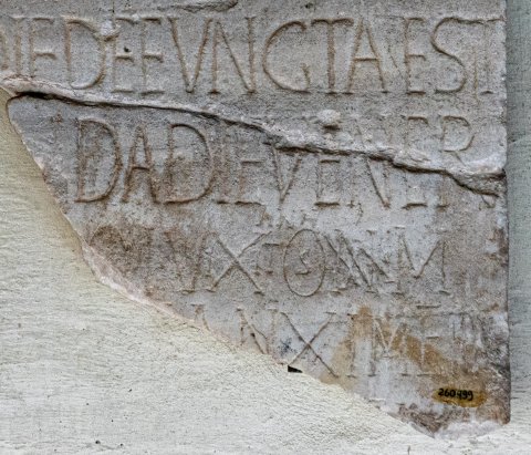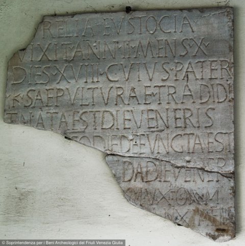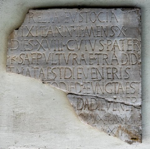 - [A]urelia Eustocia / vixit ann(os) II mens(es) X / dies XVIII cuius pater / k(orpus?) s{a}epulturae tradidi/t nata est die Veneris / [ora XI] eo die defuncta est / [ora secu]nda die Vener/[isb(!) Iovina] q(u)i vixit annos [---] M(arcus) / [Iovinus a]nn(os) XII me(nses) IIIIII / [d(ies) VI requiescit III]