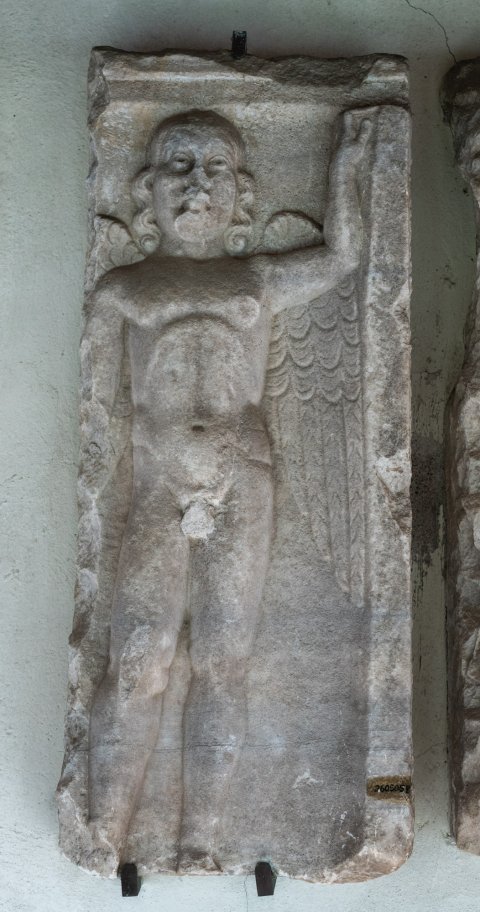 - gerahmte Schrifttafel zwischen Seitenfeldern mit Eroten (Genius) mit erhobenen Fackeln