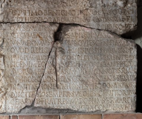 - Optimo benigno innocuoque Ce[rvonio ---] / et Theodorae Quartinae castissimae fe[minae] / qui semper su[os su]boles precibusque(!) pet[ebant] / ut cum fati m[unus] utrorumque [imperetur] / una domus [duo]bus quiescentia mem[bra teneret] / quod religi[o ---] fuit iussis paruisse pa[rentum] / hoc pia filioru[m] conpletu[m!] est mente du[orum] / sig(!) enim eor[um] merita poscebant et dic[ta] / quorum praec[l]ara fuit vita notissima f[acta] / o pudor o bonitas conveniens sempe[r amari] / dignitas honesta honestisq(ue) conlata praec[l]ara ti[more] / discite sic semper suboles genitoribu[s esse] / Cervenii fratres Marcellus et Marce[llinus] / hic contra votum suum conderunt [sepulchrum]