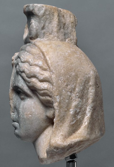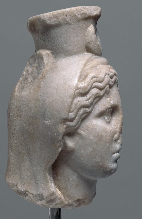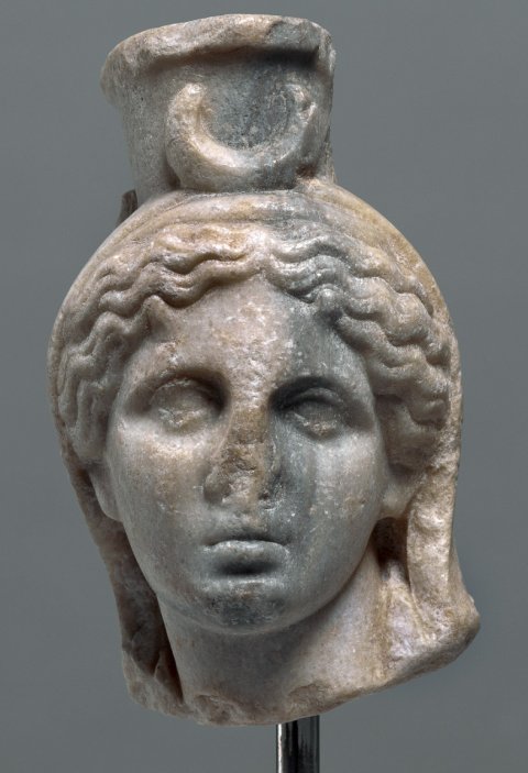 - Mythische Figur: Kopf einer Göttin mit Schleier, Kalathos und Mondsichel (Isis-Selene).