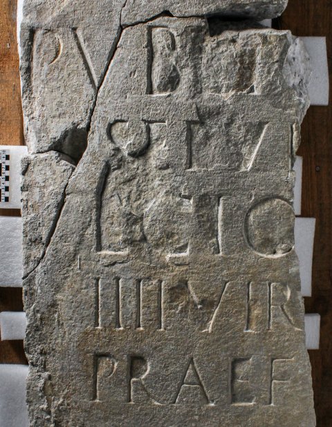 - Publice d(ecreto) d(ecurionum) loc[us] / sepulturae datus / [---] Ulcio L(uci) f(ilio) fi[l]io Ca[---] / IIIIvir(o) praef(ecto) fabrum [---] / praef(ecto) i(ure) d(icundo) ex d(ecreto) d(ecurionum)