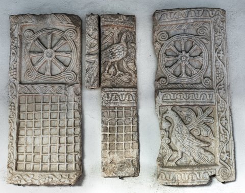 - Horizontal in zwei Zonen geteilt, oben Radmotive und Vogel mit Ranken und Flechtwerk, unten Gitter und Pfau mit Ranken. Auf den Rahmenleisten Weinranken.