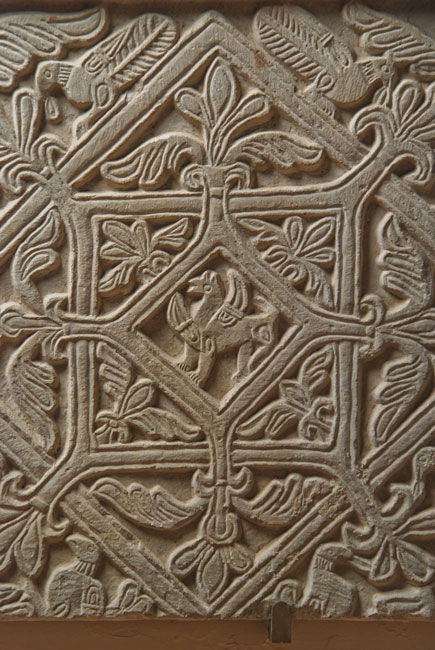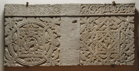 - Schrankenplatte mit zwei Flechtwerk-Feldern und ornamentierter Rahmenleiste oben