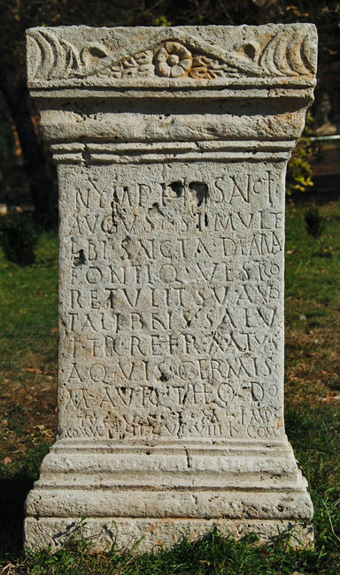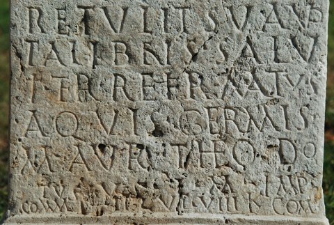 - Nymphi[s] sanctis / August(is) simul et / tibi sancta Deana(!) / fontiq(ue) vestro / retulit sua vo/ta libens salu/ti ter refirmatus / aquis Germis(ensibus?) / M(arcus) Aur(elius) Theodo/tus v(otum) s(olvit) l(ibens) m(erito) Imp(eratore) / Comm(odo) [Fe]lice c(onsule) VI VIII Kal(endas) / Com(modas)