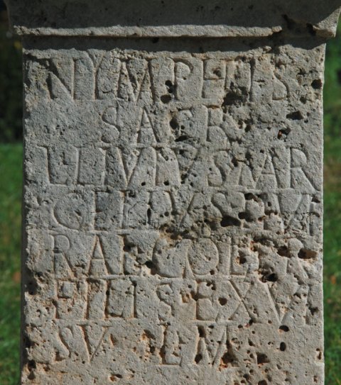 - Nymphis / sacr(um) / L(ucius) Livius Mar/cellus IIvi/ral(is) col(oniae) pro / fili(i)s ex vi/so l(ibens) m(erito)