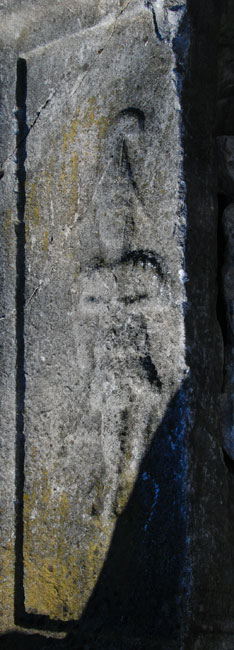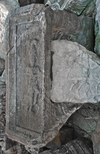 - Schriftseite ausgehöhlt, unten u. oben verbr., Sockel u. Bekrönung fehlen
