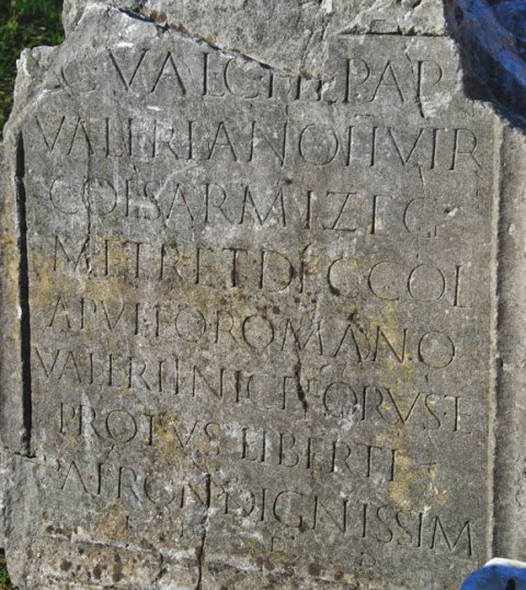 - C(aio) Val(erio) C(ai) fil(io) Pap(iria) / Valeriano IIviro / col(oniae) Sarmizeg(etusae) / metr(opolis) dec(urioni) col(oniae) / Apul(ensis) eq(uiti) Romano / Valerii Niceforus et / Protus liberti / patron(o) dignissim(o) / l(ocus) d(atus) d(ecreto) d(ecurionum)